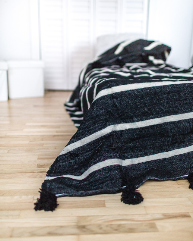 Indulge in ultimate comfort with our exquisite Black Striped Moroccan Pom Pom Blanket. Handcrafted from premium wool by skilled Moroccan artisans, this versatile blanket showcases chic black pom poms on two sides. Whether elegantly draped over your bed, cozily thrown over your sofa, or stylishly used for outdoor picnics and camping on chilly winter nights, this luxurious blanket will transform any space. With customizable dimensions and crafted from 100% handwoven cotton, this timeless piece proudly made in Morocco is a must-have addition to your decor for a touch of sophistication and warmth.