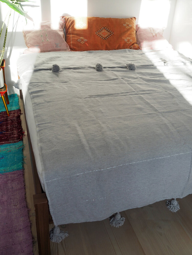 Elevate your space with the artisanal elegance of Blanket 208, a handcrafted Cotton Grey Moroccan Pom Pom Blanket from Morocco. Featuring charming Grey pom poms on two sides, this versatile blanket adds a touch of sophistication to any room. Use it as a bedspread, sofa throw, picnic rug, or cozy camping blanket. Crafted from 100% handwoven cotton, this blanket is suitable for all seasons and occasions. With customizable dimensions available, this blanket is perfect as a throw, lap blanket, or a stunning decorative piece. Experience the unique craftsmanship and charm of this Moroccan blanket and transform your space effortlessly.