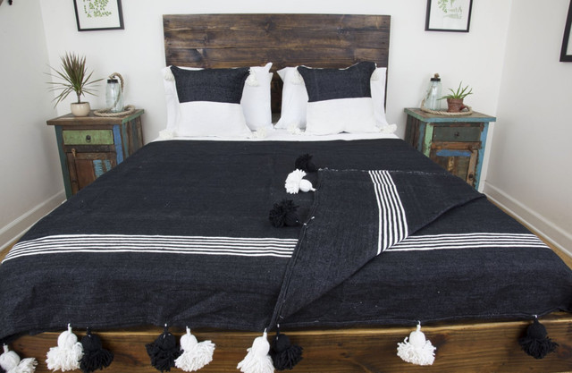 Add a touch of elegance to your home decor with our White and Black Striped Moroccan Pom Pom Blanket. Handmade from 100% premium wool by skilled local artisans, this luxurious blanket features charming pom poms on both sides, creating a cozy and stylish addition to any space. Whether draped over your bed as a sophisticated bedspread, thrown over your sofa for a chic look, used as a picnic rug for outdoor gatherings, or taken along as a warm camping blanket, this versatile piece adds an air of grace and warmth. Customizable dimensions ensure a perfect fit for any area, making this blanket a unique manifestation of expert craftsmanship and timeless style. Discover the comfort and beauty of our exclusive Moroccan Pom Pom Blanket.
