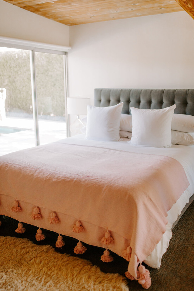 Indulge in luxurious comfort with our exquisite handmade Moroccan Pom Pom Blanket in Baby Pink. Crafted from 100% soft wool by talented local artisans in Morocco, this cozy blanket is adorned with charming pink pom poms on two rows, adding a touch of elegance to any space. Versatile and stylish, it can be used as a bedspread, sofa throw, picnic rug, or camping companion, offering endless possibilities for your decor. Customizable dimensions ensure a perfect fit, making it ideal for any room in your home. Handwoven with care, this unique treasure effortlessly combines quality and charm. Elevate the warmth and style of your surroundings with this exceptional handcrafted blanket. Experience the beauty and craftsmanship of Moroccan design with this stunning piece.