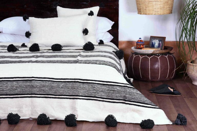 Elevate your space with our Handmade Moroccan Striped Pom Pom Blanket. Crafted from premium 100% wool, this elegant blanket features chic black pom poms, offering versatility and style as a bedspread, sofa throw, or picnic accent. Customizable dimensions ensure a perfect fit for any area, making it a must-have decor piece. Experience luxury and craftsmanship in this unique Moroccan creation.