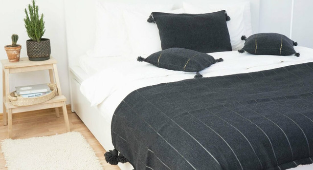 Indulge in the luxury and charm of our Hand-Woven Black Moroccan Pom Pom Blanket. Meticulously crafted from 100% cotton by skilled artisans in Morocco, this exceptional blanket features trendy black pom poms on two sides, exuding a contemporary and chic appeal. Whether draped over your bed, folded on the sofa, spread out for a picnic, or used as a cozy camping essential, this versatile blanket adds a touch of elegance to any setting. Customizable dimensions ensure a perfect fit for your space, while the premium quality guarantees both comfort and style. Elevate your decor with this exquisite Moroccan Pom Pom Blanket that seamlessly blends affordability with sophistication.