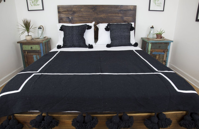 Elevate your decor with the Handmade Black Moroccan Pom Pom Blanket. Skillfully crafted in Morocco, this stunning blanket features a unique White pattern with Black pom poms. Versatile as a bedspread, sofa throw, or picnic rug, it adds warmth and style to any space. Customize the dimensions to suit your needs and enjoy the comfort of 100% handwoven cotton. Embrace sophistication with Blanket 107, a timeless piece that seamlessly blends functionality and elegance. Price: $0.00.