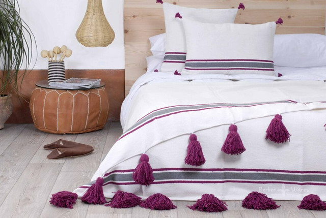 Handwoven Moroccan Pom Pom Cotton Blanket – White/Purple