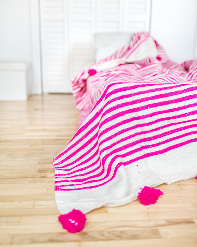 Immerse yourself in the exquisite artistry of Moroccan craftsmanship with our Pink and White Striped Pom Pom Blanket. Skillfully handcrafted by talented artisans, this wool blanket boasts charming Pink pom poms on two sides for a touch of whimsical charm. Versatile and chic, it can be used as a bedspread, sofa throw, picnic rug, or camping companion. Made from 100% handwoven cotton, this cozy blanket brings warmth and charisma to any space, adding a unique Bohemian touch to your decor. Elevate your home with this vibrant masterpiece inspired by Moroccan design, offering style and comfort in one beautiful package.