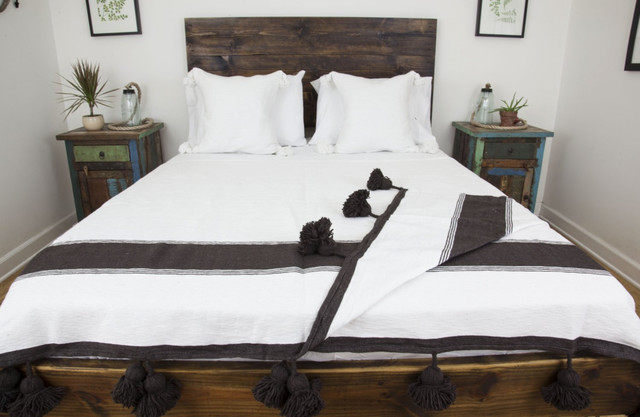 Experience luxurious comfort with our Moroccan Pom Pom Blanket! Hand-crafted by talented artisans in Morocco, this elegant white and black striped blanket features delightful pom poms on two sides. Made from 100% cotton, it is not only versatile but also stylish, adding charm to any space as a bedspread, sofa throw, picnic rug, or camping essential. Elevate your decor with this unique custom-sized blanket that radiates warmth and charisma.