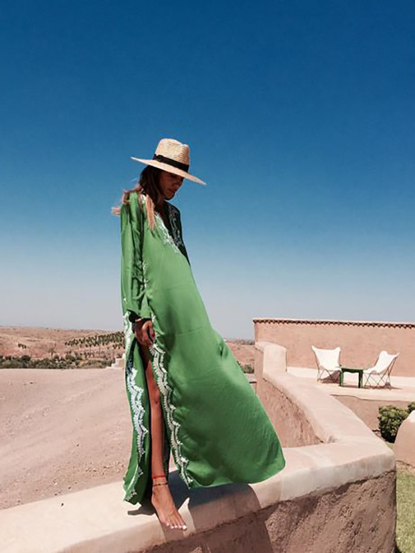 Step into luxury with our Vacation Maxi Moroccan Beach Cover Up. Inspired by the traditional Moroccan Kaftan, this Caftan features stunning prints and designs, a flowy silhouette, front slit, and a luxurious silky feel. Perfect for hot summer days, this oversized and lightweight garment effortlessly transitions from casual wear to a special occasion outfit. Elevate your beach style and feel like royalty on your next vacation!