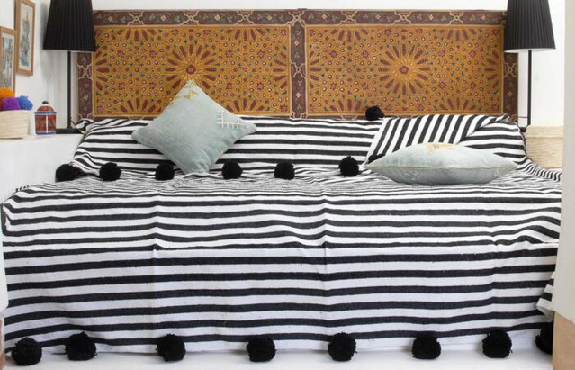 Introduce a touch of Moroccan charm and elegance to your living space with our Handmade Moroccan Pom Pom Throw Blanket. Carefully crafted by skilled local artisans, this versatile blanket features stylish black pom poms on a classic Black & White Striped design. Handwoven from 100% cotton, this blanket is not only chic but also durable, serving as a luxurious bedspread, cozy sofa throw, stylish picnic rug, or essential camping companion. Enhance the ambiance of any room with this timeless piece that can be customized to fit your space perfectly.