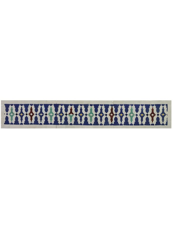 Enhance your space with the Handmade Moroccan Mosaic Border Multi Colors. Featuring intricate patterns in blue, red, teal, and white, these glazed tiles offer durability and water resistance. Perfect for walls, floors, and indoor/outdoor settings. Elevate your decor with this exquisite mosaic border.