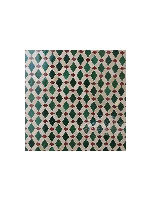 Elevate your décor with the Moroccan Mosaic Pattern Multi Colors, featuring a striking geometric design with green lozenge shapes on a white background accentuated by red accents. These top-quality tiles are perfect for walls and floors, infusing your home with an authentic Moroccan vibe. Designed to the highest standards, these mosaic tiles boast a glazed finish and multiple color choices to cater to your preferences. Ideal for residential spaces, including kitchens, bathrooms, pools, backsplashes, and countertops, both indoors and outdoors, these tiles offer outstanding durability and water resistance, ensuring longevity in any environment.