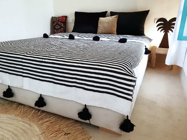 Elevate your space with our Handmade Moroccan Pom Pom Blanket. Handcrafted from soft wool in Morocco, this cozy blanket features chic black and white stripes and playful black pom poms. Versatile and charming, it adds warmth to any setting as a bedspread, sofa throw, or picnic rug. Custom dimensions are available for a perfect fit. Made from 100% handwoven cotton, this blanket offers affordable luxury that brings a touch of elegance to your home. Experience ultimate coziness and style with this exquisite piece that enhances your decor and keeps you snug on cold winter nights.