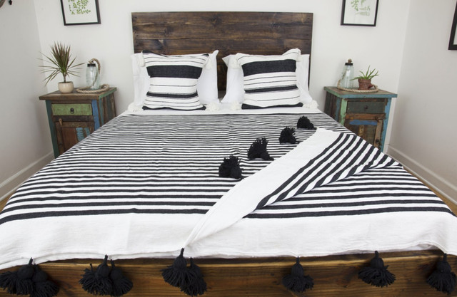 Elevate your home décor with our luxurious Moroccan Pom Pom Blanket. Handcrafted in Morocco, this elegant White and Black striped blanket is accentuated with charming Black pom poms on two sides. Versatile and stylish, it can be used as a bedspread, sofa throw, picnic rug, or camping essential. Made from 100% handwoven cotton, this blanket exudes luxury and offers cozy comfort in colder seasons. Immerse yourself in the finest Moroccan craftsmanship with this chic and cozy addition to your living space.