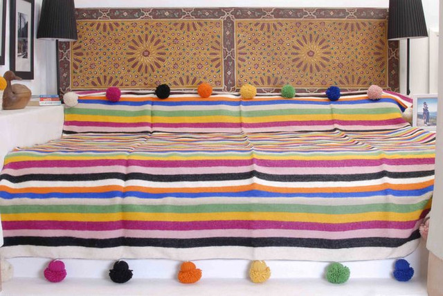 Elevate your space with our Hand-woven Moroccan Pom Pom blanket. Crafted by local artisans using premium 100% wool, this cozy blanket is perfect for bedspreads, sofa throws, picnic rugs, or camping blankets. Enjoy the colorful pom poms that add warmth and style to any room. Transform your space with the exotic allure of the Moroccan Pom Pom Blanket. Handcrafted by local artisans in Morocco using 100% wool, this cozy blanket showcases vibrant pom poms adorning two edges for a pop of color and charm. Whether draped over your bed, couch, used as a picnic rug, or a camping companion, this versatile piece adds warmth and style to any setting. With customizable dimensions, it ensures a perfect fit for your unique needs. Made from premium handwoven cotton, this blanket seamlessly combines functionality and aesthetics, infusing your space with cozy vibes and a touch of Moroccan culture. Benefit from complimentary shipping and bring home this exquisite piece.