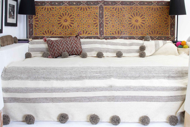 Wrap yourself in the luxurious comfort of our Handcrafted Moroccan Pom Pom Blanket. Made from 100% wool by skilled artisans in Morocco, this exquisite blanket is adorned with charming pom poms on two sides, adding a whimsical touch to any space. Whether used as a cozy bedspread, a stylish sofa throw, or a chic decor accent, this custom-sized blanket radiates elegance and warmth. Perfect for picnics, camping, or simply snuggling up at home, this blanket is a versatile and timeless addition to any setting. Elevate your surroundings with the artisanal craftsmanship and cozy allure of our Moroccan Pom Pom Blanket.