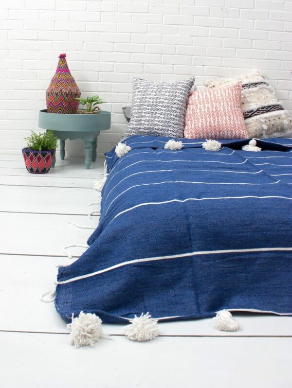 Enhance your living space with our Dark Blue Pom Pom Blanket, expertly handwoven by Moroccan artisans. Crafted from 100% cotton, this versatile blanket features chic gray pom poms, infusing a sense of sophistication and allure into any room. Ideal for use as a bedspread, sofa throw, picnic blanket, or camping essential, this blanket seamlessly combines practicality with style. The customizable dimensions offer versatility, allowing you to use it as a throw, lap blanket, or as a fashionable decor staple. Embrace the essence of Morocco in your home with this beautifully crafted blanket.