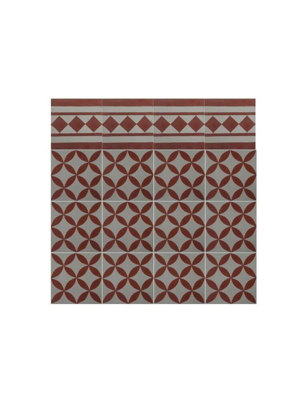 Enhance your living space with the captivating Moroccan Cement Tiles Border in Red & White. This exquisite design boasts a vibrant red base with a striking white lozenge strip, accented by intricate geometric patterns. Crafted from high-quality cement, this glazed tile offers durability, water resistance, and a touch of sophistication. Ideal for embellishing indoor or outdoor walls and floors, this border tile adds a luxurious touch to any area. Elevate your home with this durable and visually appealing Moroccan border tile. Price: $0.00.