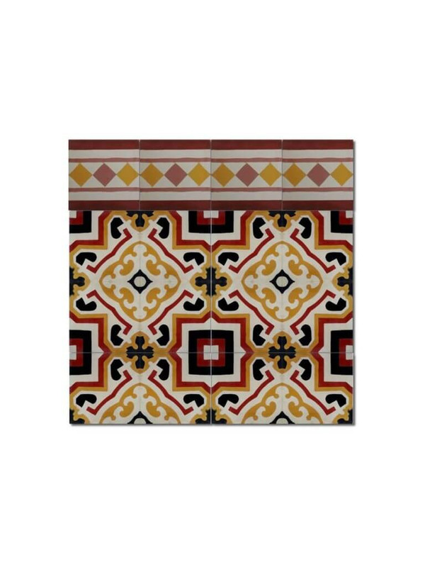 Transform your space with the vibrant Moroccan Cement Border in eye-catching red and yellow tones. Influenced by traditional Mexican hues, this top-quality tile showcases intricate floral patterns and elegant lozenge chain designs. Ideal for both wall and floor tiling, the glazed finish offers a choice between a matte or glossy appearance, adding a touch of elegance to any space. Durable and water-resistant, this border tile is perfect for indoor and outdoor areas, infusing your home with rich colors and substantial designs. Elevate your decor with this exquisite Moroccan Cement Border, priced at $0.00 and sold with various custom attributes.