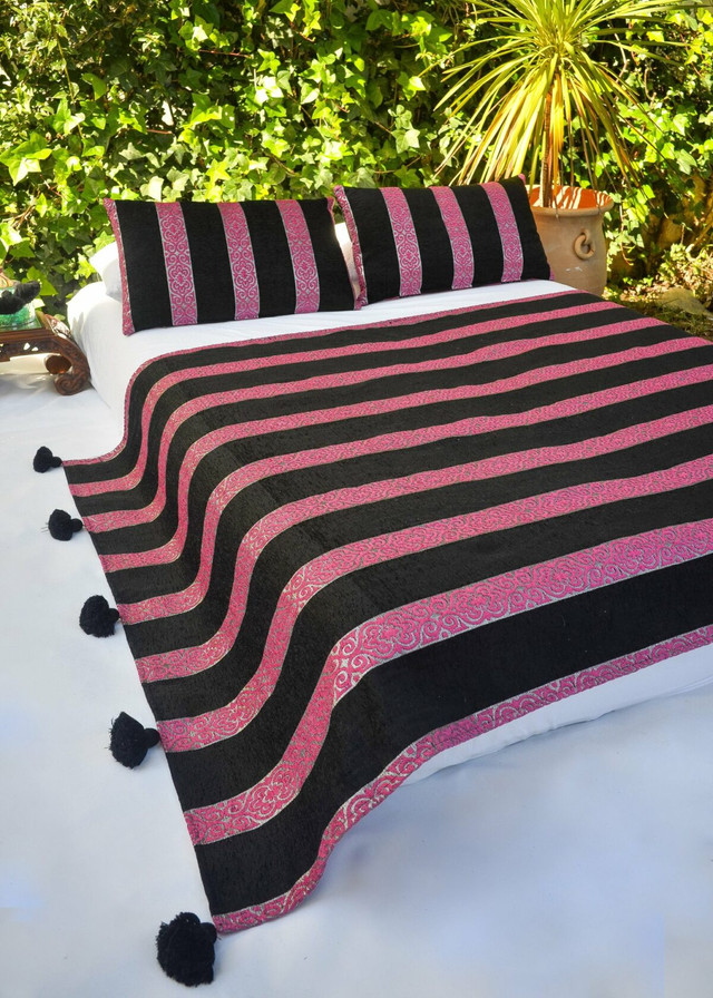 Luxuriate in sophistication with our Pink and Black Striped Moroccan Pom Pom Blanket. Handcrafted by skilled Moroccan artisans from 100% wool, this exquisite blanket showcases chic black pom poms on two sides for an added touch of charm. Versatile and elegant, utilize it as a bedspread, sofa throw, picnic rug, or essential camping companion. With customizable dimensions, effortlessly elevate any room as a stylish throw, lap blanket, or decorative centerpiece. Infuse your space with Moroccan-inspired vibes using this cozy blanket that radiates warmth and style. Originating from Morocco, this timeless piece is a must-have for enhancing your home decor. Discover the blend of luxury and practicality in this blanket that promises to transform your space effortlessly.