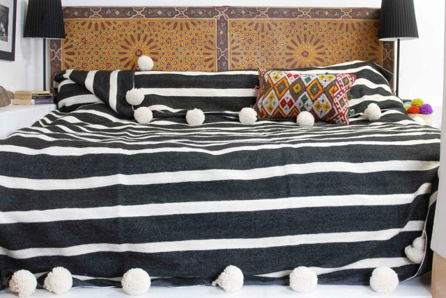 Transform your space with our Handcrafted Black and White Moroccan Pom Pom Blanket. Skillfully made by artisans in Morocco, this cozy blanket features striking red pom poms for a touch of sophistication. Perfect for various uses, such as a bedspread, sofa throw, picnic rug, or camping essential, this versatile piece adds warmth and style to any setting. Tailored dimensions allow for a customized fit, making it an ideal lap blanket or decorative element. Crafted from 100% handwoven cotton, this blanket is not only luxurious but also durable. Enhance your home decor with this timeless and eye-catching blanket, offering exceptional value at a competitive price.