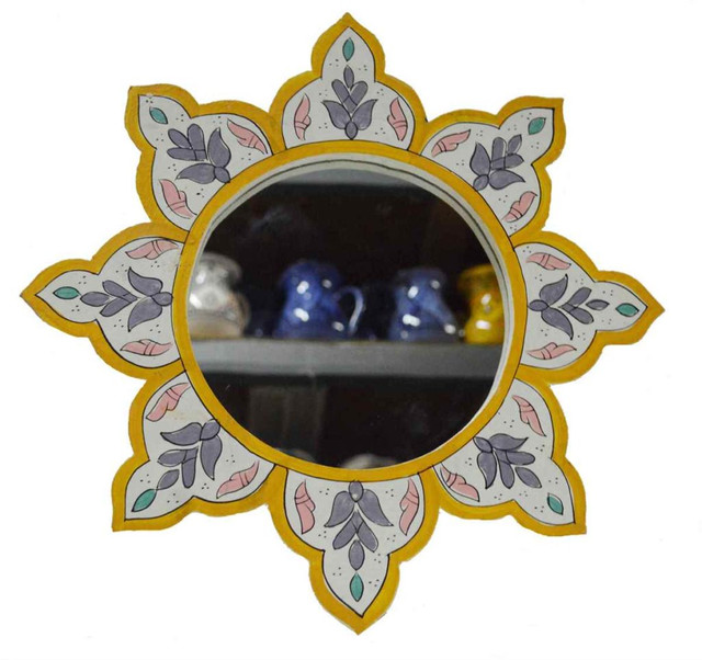 Transform your living space with the elegant Flower-shaped Vintage Moroccan mirror. Adorned with traditional motifs on a vibrant yellow frame, this distinctive piece brings a touch of refinement to any space. Meticulously handcrafted by talented Moroccan artisans, this mirror offers customizable sizing, a convenient rear hook for effortless installation, and easy upkeep. Crafted from premium materials, it features a flat central mirror for functional use. Elevate your home décor with a hint of timeless sophistication through Mirrors 113. Price: $0.00. Includes unique product attributes.
