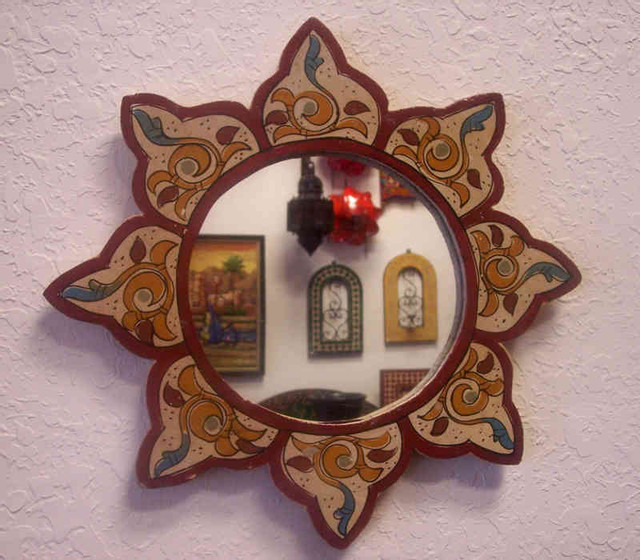 Enhance your home decor with the elegant Flower-shaped Vintage Moroccan Mirror. Handcrafted by skilled artisans, this vibrant red-framed mirror exudes traditional charm with its hand-painted designs. Ideal for hallways, bedrooms, and living rooms, this premium mirror offers custom dimensions for a perfect fit in your space. Elevate your living area with a touch of Moroccan sophistication while enjoying the ease of maintenance and hanging. Experience timeless beauty with this exquisite piece.