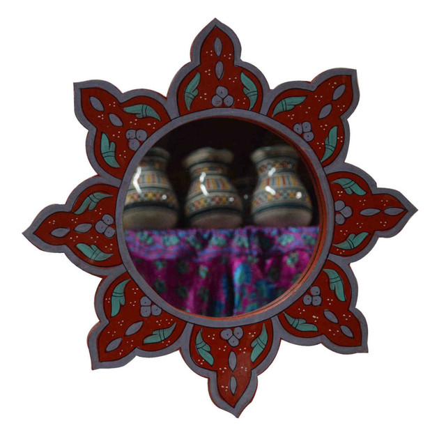 Enhance your decor with the captivating Flower-shaped Vintage Moroccan mirror. This stunning piece is hand-painted with intricate designs on a vibrant red frame by skilled Moroccan artisans. The high-quality craftsmanship adds elegance to any space, making it perfect for your hallway, bedroom, or living room. With its custom dimensions, easy hanging mechanism, and simple cleaning process, this mirror effortlessly infuses Moroccan charm into your home decor. Embellish your surroundings with this visually appealing accent piece that radiates elegance and sophistication.