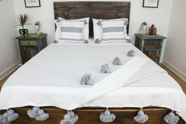 Enhance your living space with our luxurious White and Grey Striped Moroccan Pom Pom Blanket. Handcrafted by talented Moroccan artisans from premium wool, this blanket exudes elegance with its stylish Grey pom poms. Versatile and chic, it serves as a bedspread, sofa throw, picnic rug, or camping essential, offering both warmth and sophistication. Customizable dimensions add a personal touch, making it a perfect throw blanket or home decor accessory. Crafted from 100% handwoven cotton, this masterpiece from Morocco combines comfort and style seamlessly. Elevate your surroundings with this cozy and chic Moroccan-inspired blanket for a touch of affordable luxury.